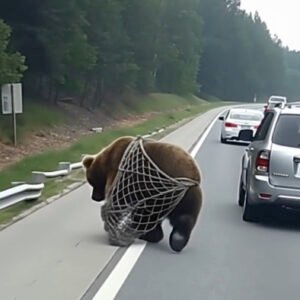On the road, I noticed a bear tangled in a net, unable to free itself: