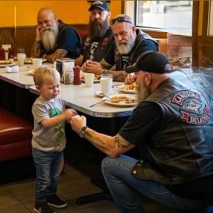 In a quiet small-town diner, a group of bikers had just settled into a corner booth after a long ride. Their leather jackets and booming laughter made…