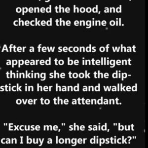 After a few seconds of what appeared to be intelligent thinking she took the dipstick in her hand and walked over to the attendant. “Excuse me,” she…