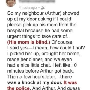I learned the hard way that kindness can backfire. When I agreed to help my neighbor, Arthur, by picking up his blind mother, Maria, from the hospital,…
