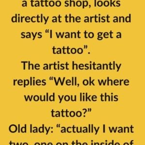 An old woman walks into a tattoo shop, looks directly at the artist and says “I want to get a tattoo”. The artist hesitantly replies “Well, ok…