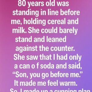 An old lady, about eighty years old, was standing in line in front of me, holding a box of cereal and a gallon of milk. She looked…