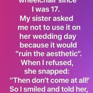 I’ve been in a wheelchair since I was seventeen. When my sister got engaged, she asked me not to use it at her wedding because it would…
