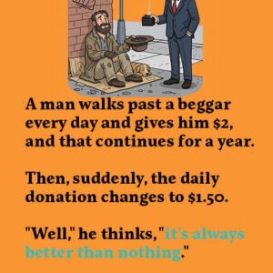 A man walks past a beggar every day and gives him $2, and that continues for a year. Then, suddenly, the daily donation changes to $1.50. “Well,”…