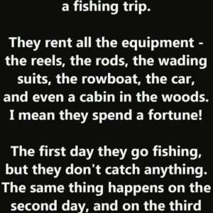 Two Virginia rednecks go on a fishing trip. They rent all the equipment – the reels, the rods, the wading suits, the rowboat, the car, and even…