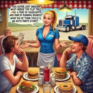 A trucker walked into a truck stop café and gave his order. He said, “I’ll have three flat tires, a pair of headlights, and a pair of…