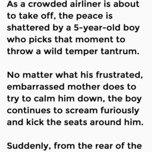 As a crowded airliner is about to take off, the peace is shattered by a 5-year-old boy who picks that moment to throw a wild temper tantrum….