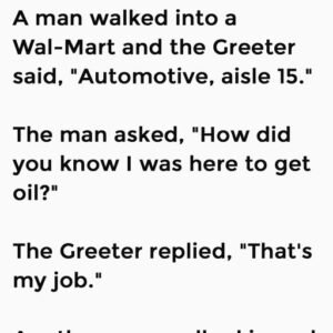 A man walked into a Wal-Mart and the Greeter said, “Automotive, aisle 15.” The man asked, “How did you know I was here to get oil?” The…