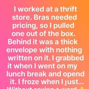 I worked at a thrift store. Bras needed pricing, so I pulled one out of the box. Behind it was a thick envelope with nothing written on…