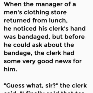 When the manager of a men’s clothing store returned from lunch, he noticed his clerk’s hand was bandaged, but before he could ask about the bandage, the…