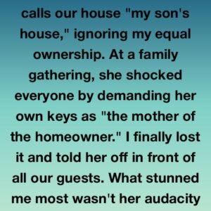 My mother-in-law always calls our house “my son’s house,” ignoring my equal ownership. At a family gathering, she shocked everyone by demanding her own keys as “the…