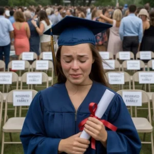 The stadium shimmered in May sunlight, a sea of navy graduation gowns and proud families clutching bouquets and cameras. When the announcer’s voice echoed through the sound…