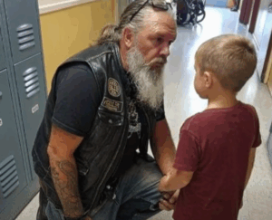 When I first noticed a man with many tattoos kneeling beside my eight-year-old son at school, I felt uncertain. He wore a leather vest and had a…