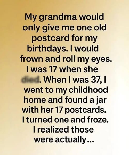 My grandma would only give me one old postcard for my birthdays. I would frown and roll my eyes. I was 17 when she died. When I…
