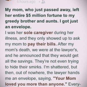 When the lawyer began reading my mother’s will, I thought I already knew what to expect. She had always been generous with my brother and our aunts,…
