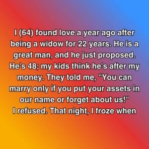 I (64) found love a year ago after being a widow for 22 years. He is a great man, and he just proposed.   He’s 48; my…