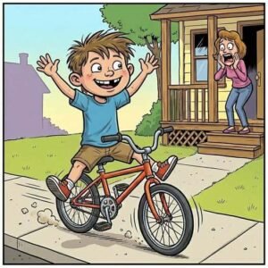 Johnny was riding his bicycle, and he sees his mom on the porch. He releases the handle and yells to his mom, “Look Mom, no hands!” His…